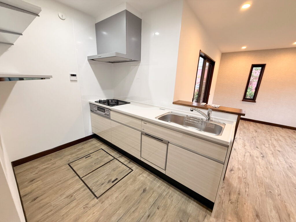 リフォーム前はキッチンからリビングが見えない状態でしたのでキッチンの場所をずらし、食器を洗いながらお子様の様子が見れるようにしました。